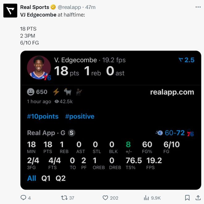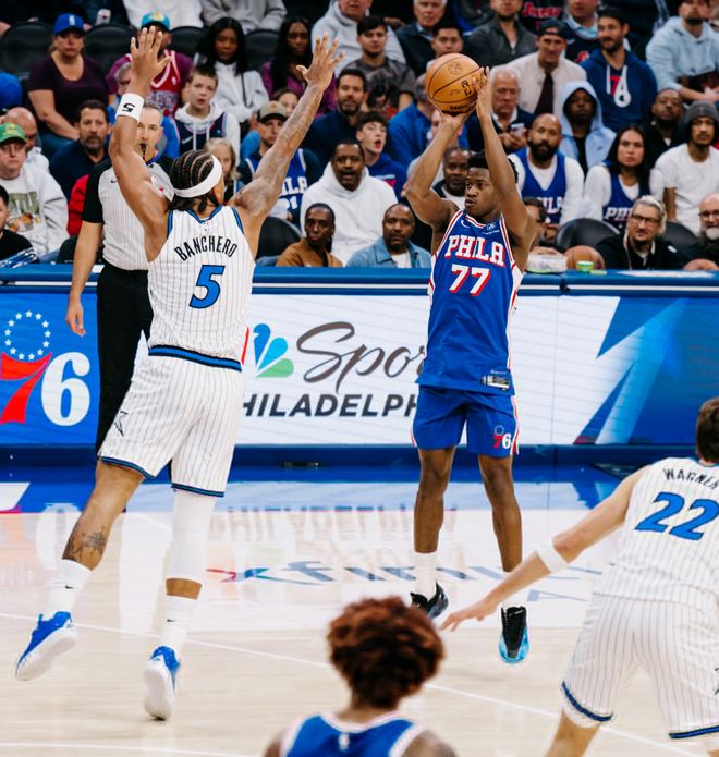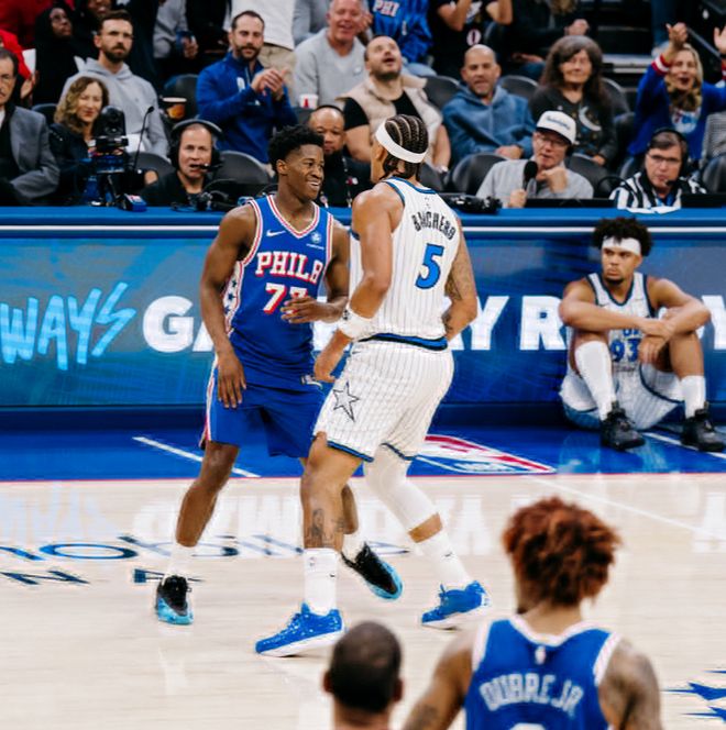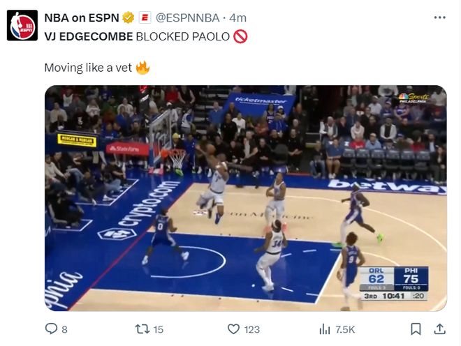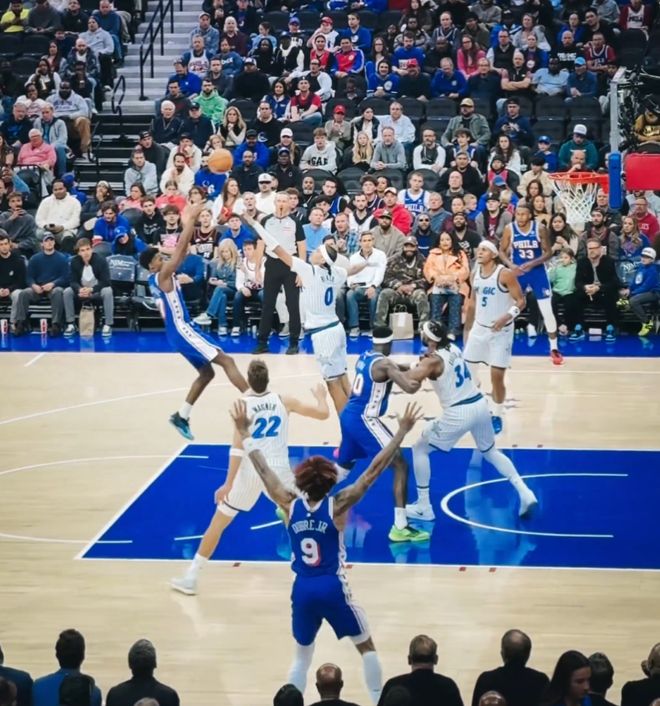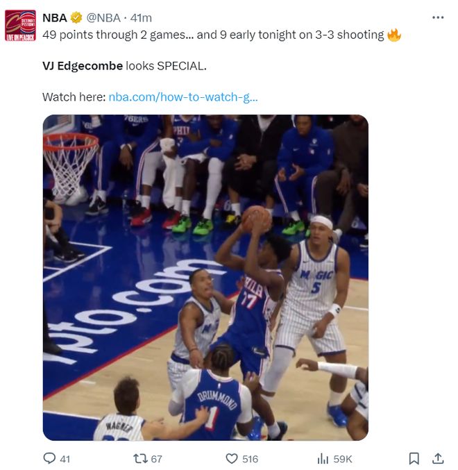 埃奇库姆阅读比赛的能力远超新秀,他在三人合围下欧洲步上篮命中,上半场17分40秒,10中6+三分4中2拿到18分4助攻1篮板。马克西22分4助攻,乌布雷16分6篮板,在没有恩比德的情况下上半场领先魔术12分。