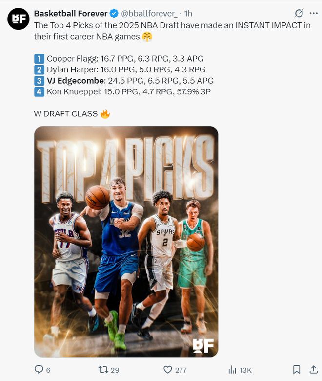 开赛的两场比赛联盟这是超级新秀们的数据,埃奇库姆场均24.5分6.5篮板5.5助攻明显优于状元伏格列、榜眼哈珀,埃奇库姆这位探花已经被誉为艾弗森接班人。