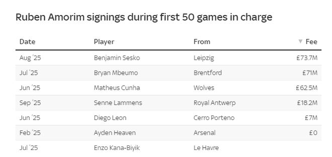 在阿莫林执教之后,曼联签入的球员较少,但转会费更高,塞斯科、姆贝莫、库尼亚、拉门斯等球员的转会费高达2.32亿英镑,明显超过了阿尔特塔执教时的同期费用。