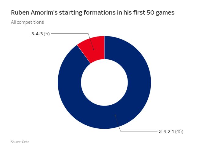 阿莫林则更加稳定,面对外界的巨大质疑,仍然坚持使用3421阵型。与阿尔特塔不同,阿莫林一直使用三中卫体系,仅5次使用343阵型。