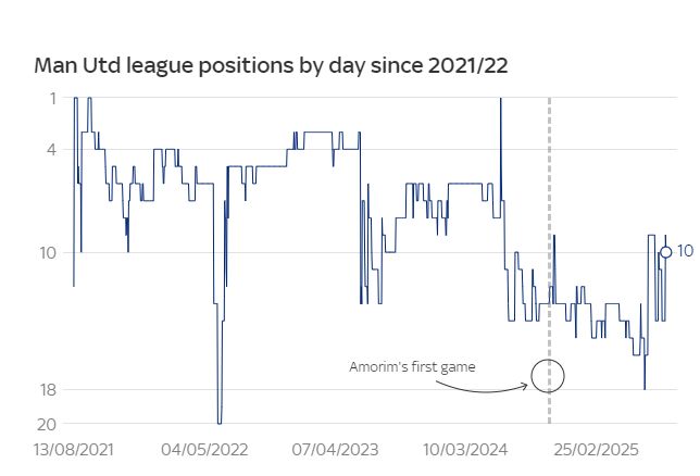在阿尔特塔执教的第一个赛季,阿森纳最终排名第8名,这是自1992-93赛季排名第10以来的最低排名。在阿莫林执教的第一个赛季,曼联排名第15名,创造俱乐部历史新低。